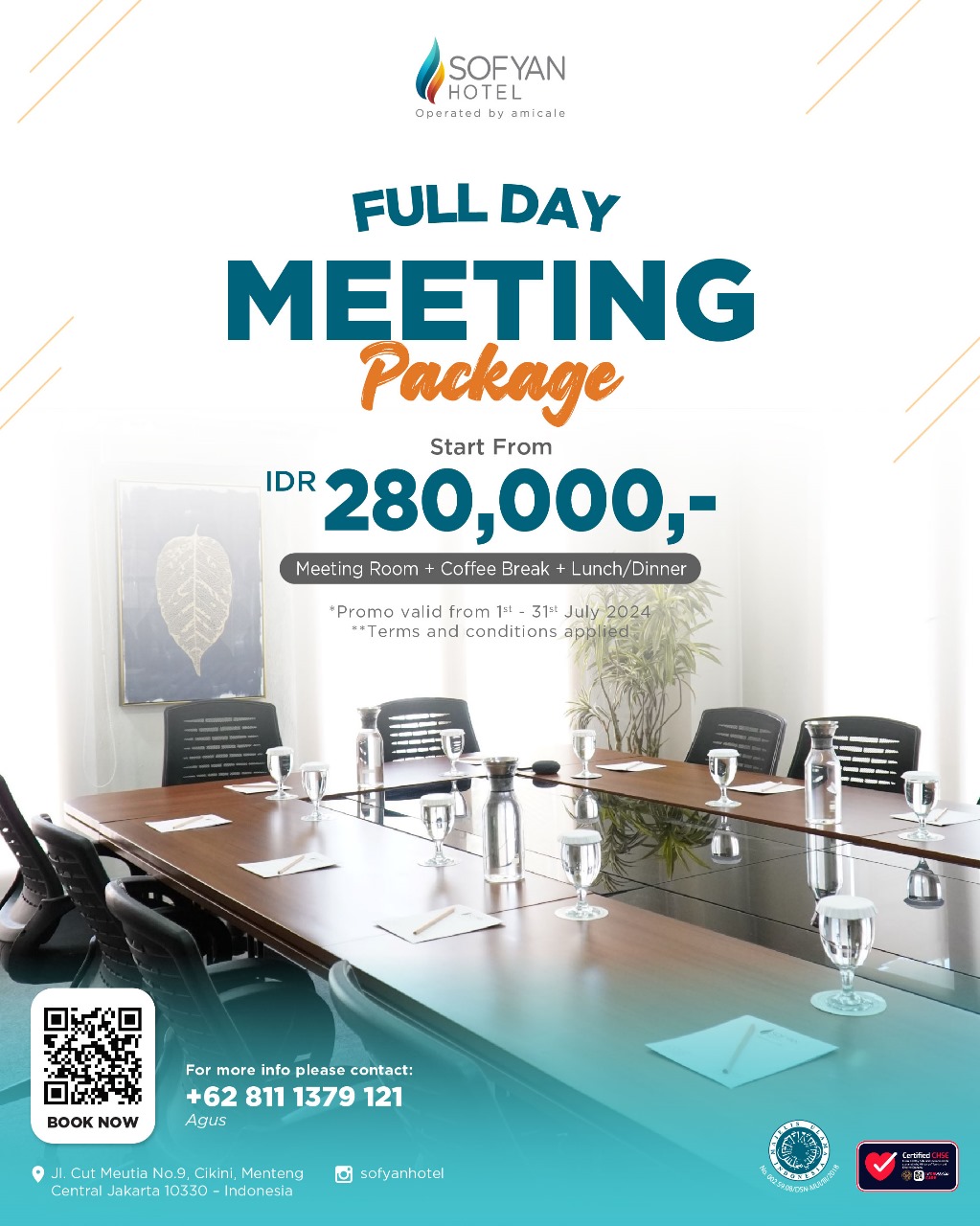 Promo ini tidak hanya tentang menghemat biaya, tetapi juga memberikan nilai tambah yang tidak ternilai. Dengan biaya yang sangat terjangkau, Anda dapat memfokuskan perhatian pada inti dari setiap pertemuan Anda tanpa khawatir akan biaya yang berlebihan.Jangan lewatkan kesempatan ini untuk mengoptimalkan produktivitas dan efektivitas pertemuan bisnis Anda di Sofyan Hotel Cut Meutia. Hubungi kami sekarang untuk reservasi atau informasi lebih lanjut. Jadikan setiap kesempatan untuk mengesankan mitra bisnis Anda dengan pelayanan dan fasilitas terbaik dari kami. Sofyan Hotel Cut Meutia siap membantu Anda mencapai kesuksesan dalam setiap pertemuan bisnis Anda. Ayo buktikan bersama bahwa setiap pertemuan bisa menjadi langkah maju yang signifikan dalam perjalanan karir Anda. Segera hubungi sales Hotel Sofyan Cut Meutia di 08118779121 atau klik ikon whatsapp yang tersedia dikanan bawah halaman ini untuk konsultasi dan reservasi ruang meeting dengan harga terbaik di bulan juli 2024.