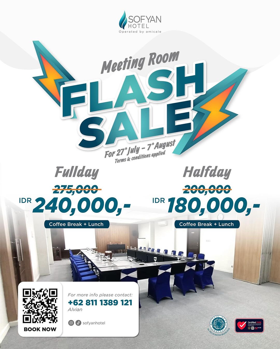 Apakah Anda sedang merencanakan rapat bisnis, seminar, atau acara penting lainnya? Jangan lewatkan kesempatan langka ini untuk memanfaatkan promo flash sale meeting room dari Sofyan Hotel Soepomo, Jakarta Selatan! Kami menawarkan paket meeting room half day dan full day dengan penawaran istimewa yang hanya berlaku untuk waktu terbatas. Dapatkan fasilitas terbaik dan layanan unggulan untuk membuat acara Anda menjadi sukses dan berkesan. Dimana promo ini berlangsung selama 01 – 07 Agustus 2024 dan 25-31 Agustus 2024. Berikut merupakan detail promo flash sale meeting room Sofyan Hotel Soepomo periode Agustus 2024.